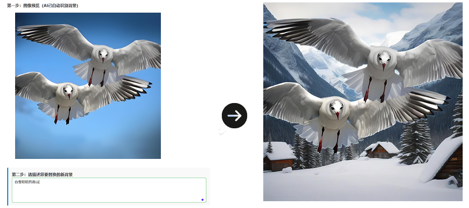 - AI 背景替换:AI 将自动识别图片主体与背景,您只需输入文字描述(如 “白雪皑皑的高山”“繁华的都市夜景”),系统便会生成全新背景并与主体无缝融合。