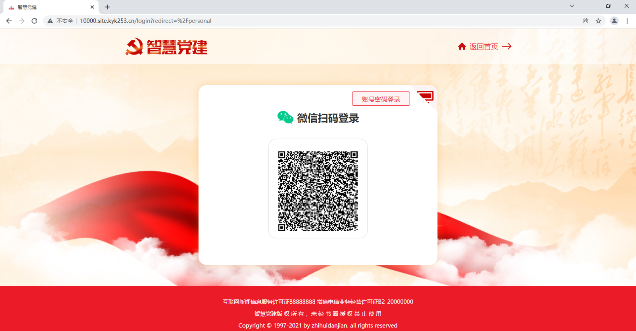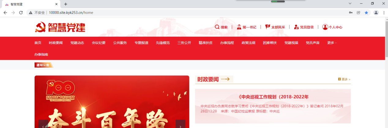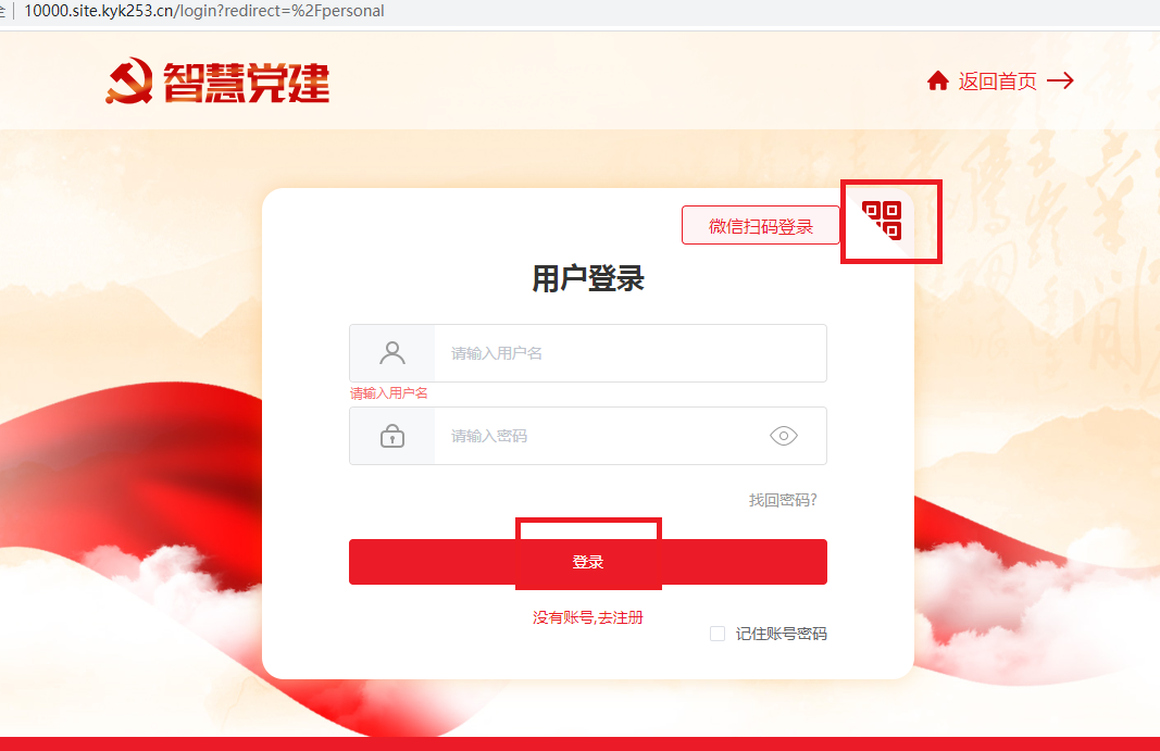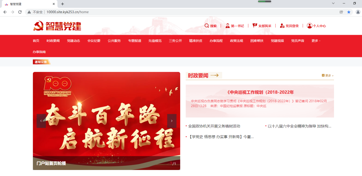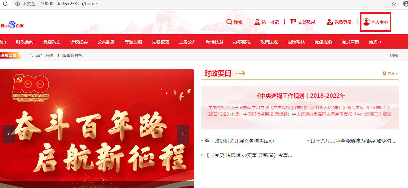 第一步:进入群众PC端前台首页,点击右上角的个人中心。未登录用户会跳转到用户登录页面。(群众PC端的电脑端网址可在党建后台-宣传-域名配置里查看)