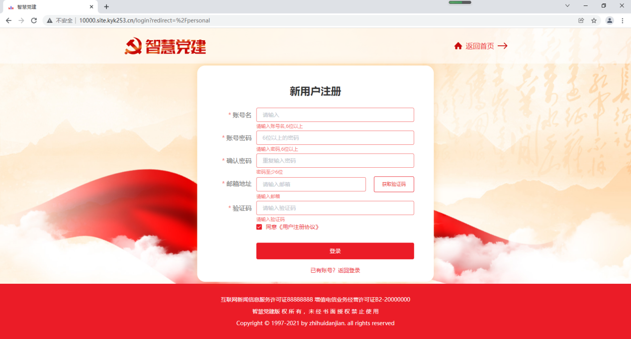 第二步:点击用户登录下方的“没有账号,去注册”,然后输入账户名、账户密码、邮箱地址(要求之前没有注册过智慧党建账号的邮箱,并且能接收邮件信息)、验证码(点击“获取验证码”,邮箱会收到验证码)、勾选”同意《用户注册协议》”。最后点击“注册”即可。