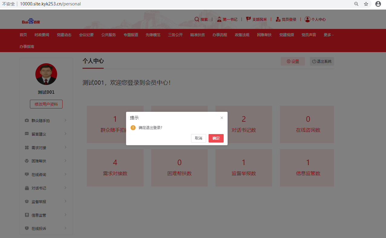 第五步:点击【退出系统】按钮,提示确认后,退出当前账户并返回到首页。如下图所示:
