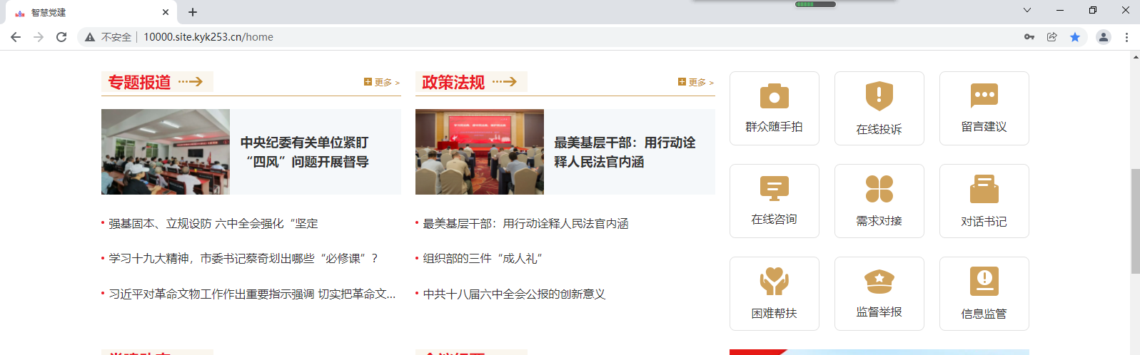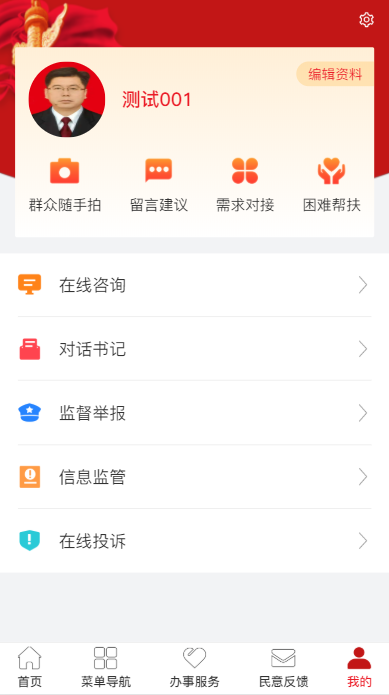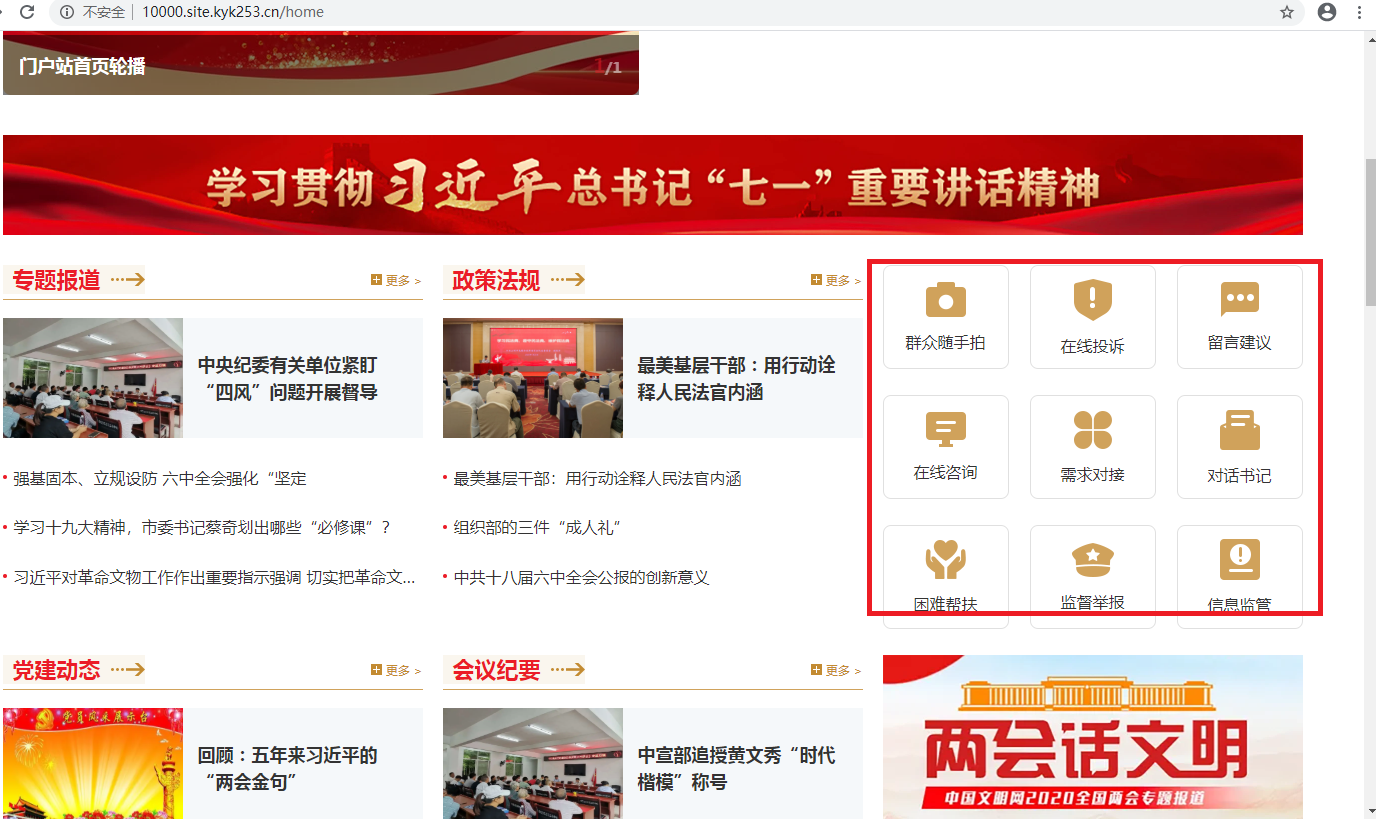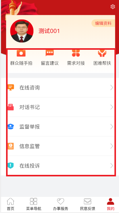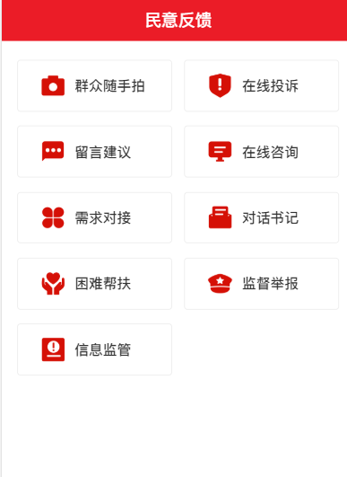 第三个:民意反馈:(群众随手拍、留言建议、需求对接、困难帮扶、在线咨询、对话书记、监督举报、信息监管、在线投拆等)。