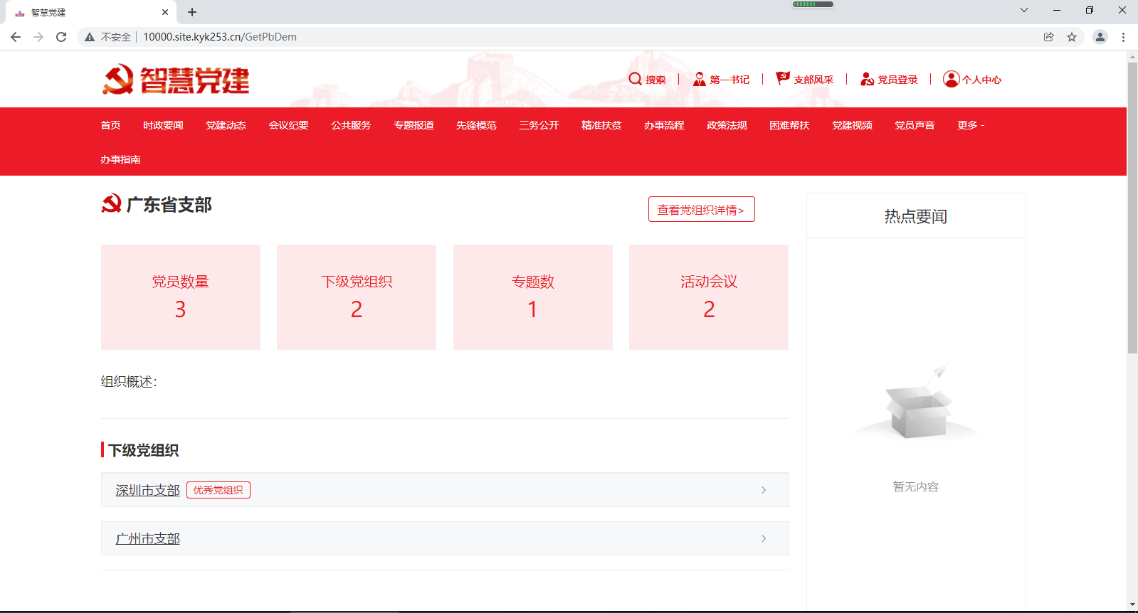 在顶部栏点击“支部风采”,进入支部风采信息展示,下级党组织可以查看各党组织信息及关系。查看党组织详情,可以看到党员及领导的信息。如下图所示: