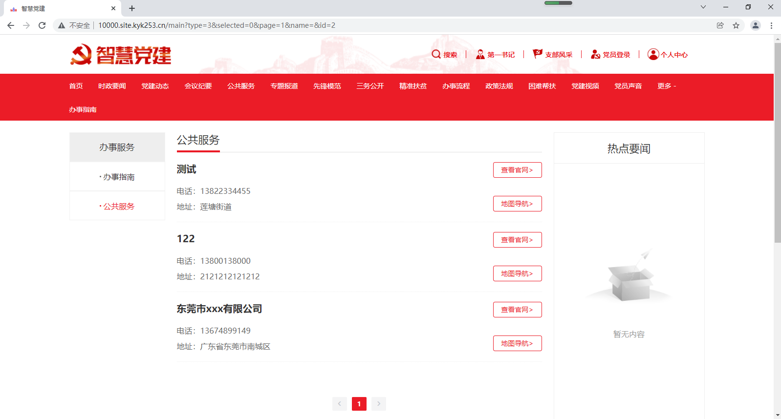 办事服务主要是展示党组织办事地址,地图和电话等信息,用户可以根据地址和地图来找到办事处的具体位置。如下图所示: