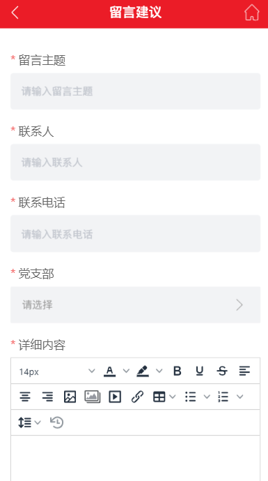 民意反馈包括:群众随手拍、在线投诉,留言建议、在线咨询,需求对接、对话书记,困难帮扶,监督举报,信息监督9大类,群众可以根据自身需求,选择要提交的民意信息。例如:输入留言建议,提交保存即可。如下图所示: