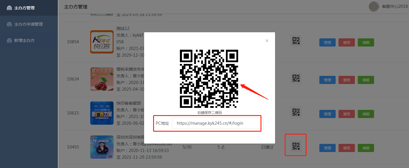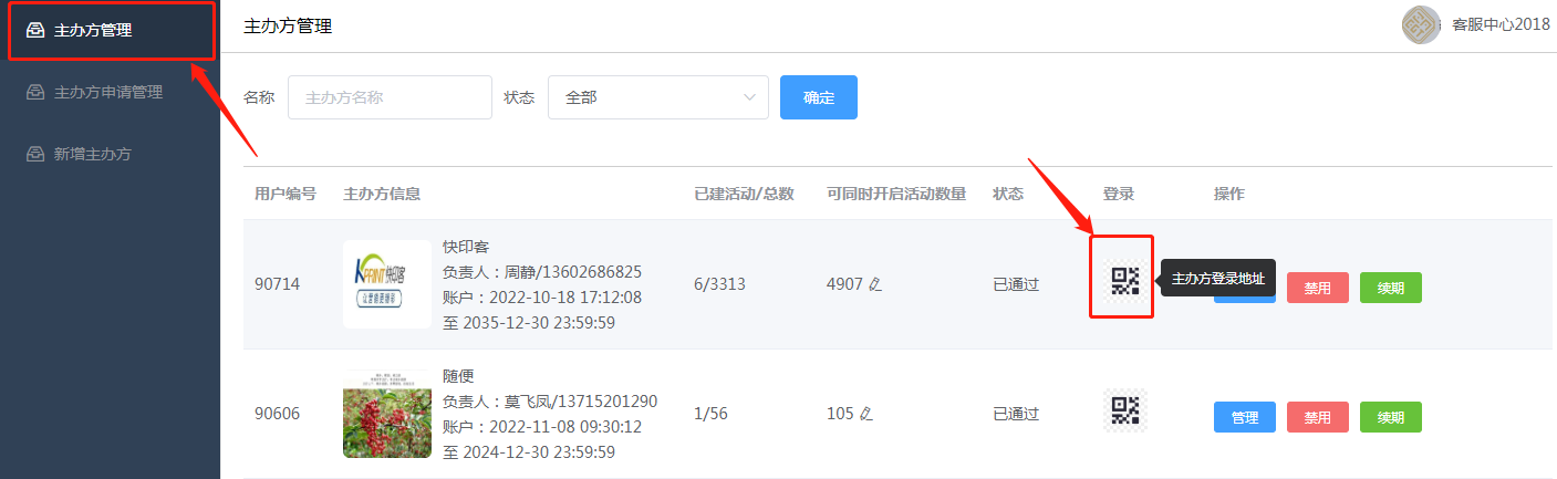 主办方可通过主办方管理-登录,打开主办方登录地址,手机扫码输入手机号接收短信验证码的方式来进行登录。或者电脑端也有单独的登录后台网址。如下图所示: