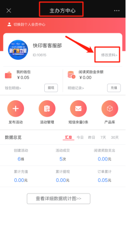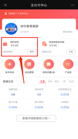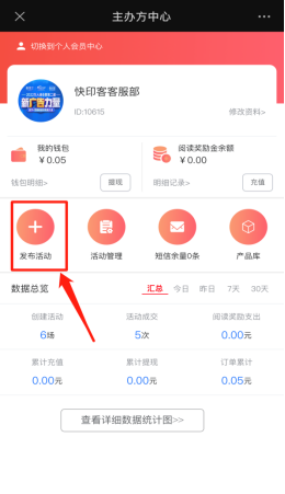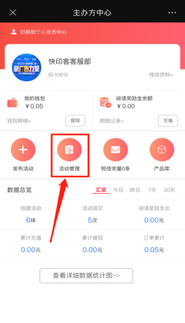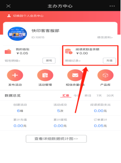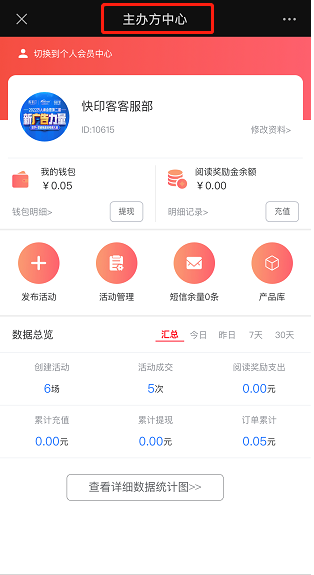 主办方中心包含主办方的基本资料修改、个人会员中心入口、我的钱包、阅读营销奖励金、发布活动、活动管理、短信余量、产品库、数据总览、查看详细统计图。如下图所示: