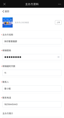 主办方基本资料,可以修改主办方LOGO、公司名称、核销密码、核销天数,联系人信息,主 办方简介等等。如下图所示: