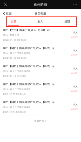 主办方钱包明细可查看全部收入,提现的记录。如下图所示: