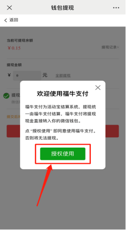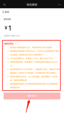 主办方提现入口,第一次提现需要点击确认授权福牛支付才可以提现(仅第一次提现确认,后续不需要)且24小时内提现只允许1次,单笔最小金额1元,24小时内到账。(注:请认真查看提现须知)如下图所示: