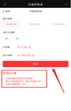 阅读奖励金充值入口,根据需要充值相应金额。注:充值金额只能是100的倍数,最小金额100元。手续费率2%。如下图所示:
