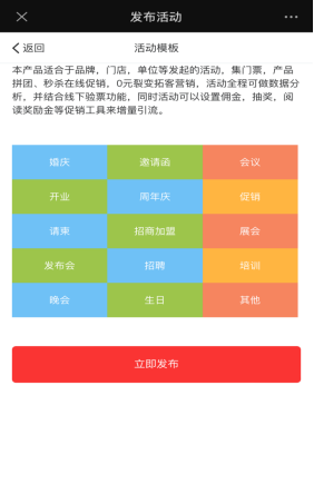 1、先选择活动模板,可根据现有的行业模板,点击选择对应适合本次活动的模板套用使用,或者选择空白模板自行搭建生成。