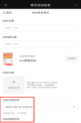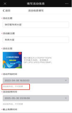 活动基本信息修改,活动主题和副主题可以修改,活动已经发布,不允许修改开始时间,结束时间,截止购票时间。只可以在活动未发布前更改时间(请检查确认好时间再发布活动)如下图所示: