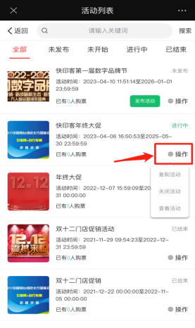 显示该主办方下所有创建的活动,进入可看到所有未发布,未开始,进行中,已结束活动。可以点击发布活动,或者点击任意活动的操作,进入查看活动,复制活动,关闭活动(谨慎操作)如下图所示: