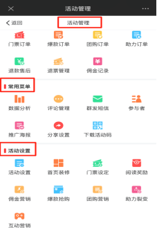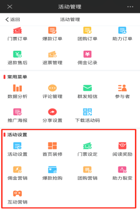活动设置:是设置该活动基本信息、活动首页装修、门票设定、阅读奖励、佣金营销、爆款抢购、团购营销、裂变助力、互动营销等。如下图所示: