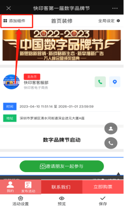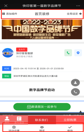 首页装修也就是活动首页显示内容的修改,可以根据活动需要添加对应的组件,设置活动全局,修改底部菜单指向设置等。可以预览活动,预览前需要先保存,再点击预览。如下图所示: