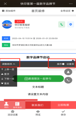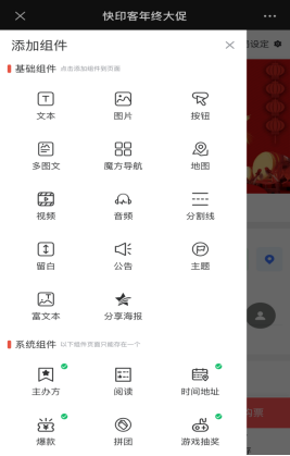 1、添加组件分为基础组件和系统组件,基础组件可以重复添加删除,系统组件只允许添加一次,不允许重复添加。每个组件可以进行样式内容调整,点击组件设置就可以进行相关样式内容调整,点击操作可以进行复制组件和删除组件,点击调整顺序可以移动组件的排序显示。如下图所示: