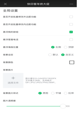 2、全局设置可以设置边距,悬浮我的按钮,客服电话,悬浮海报位置,全局背景设置,背景图片,背景音乐上传。如下图所示: