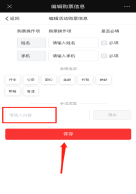 购票信息设置:是需要购买门票时填写的个人信息的设置,默认必填项为姓名,手机。可以根据需求设置其他新增填写项为必填项和非必填项。如下图所示: