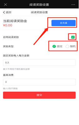 阅读奖励金需先勾选启用阅读奖励,前提主办方需要充值,账户里有阅读奖励金余额。开启后,可以设置奖励类型,固定奖励或者随机奖励,根据选择随机或者固定设置相应的奖励金金额。获得逻辑则是进入首页就即可获得,每人每个活动只可以获得一次。如下图所示: