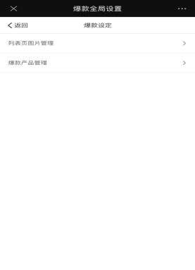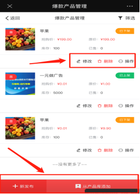 爆款设定可以添加顶部轮换图片上传,以及添加爆款产品管理,爆款产品管理可修改已存在的产品,上/下架产品,根据活动需要去发布爆款产品上架,或者选择从产品库里直接添加。如下图所示: