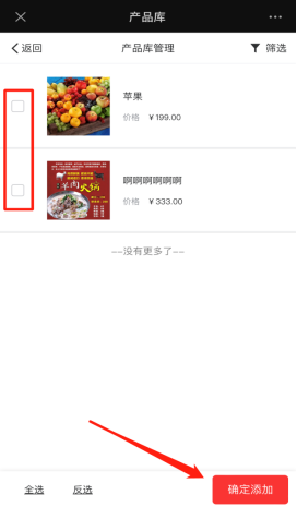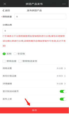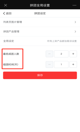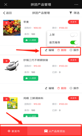 拼团设定可以添加顶部轮换图片上传,以及关于拼团全局设置,如最低成团人数,组团时间等。(活动已开始就不允许修改拼团规则)拼团产品管理可修改已存在的拼团产品信息,上/下架产品,根据活动需要去发布拼团产品上架,或者选择从产品库里直接添加。如下图所示: