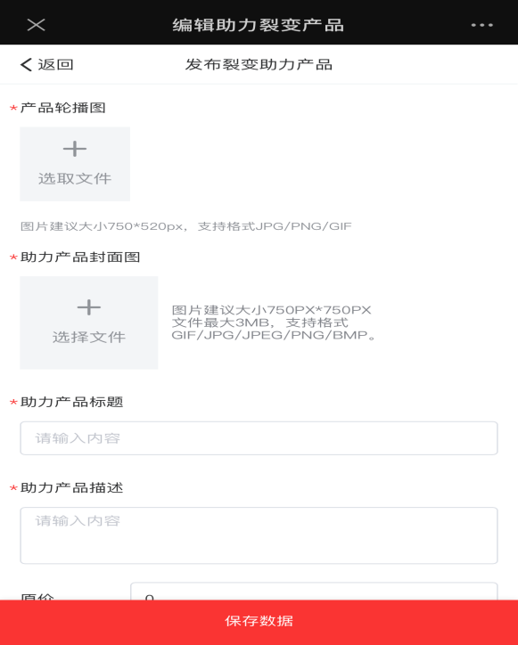 助力裂变产品可以添加顶部轮换图片上传,以及关于助理裂变产品管理,可查看修改已存在产品信息,根据活动需要去发布助力裂变产品,设置助力规则等。如下图所示: