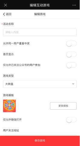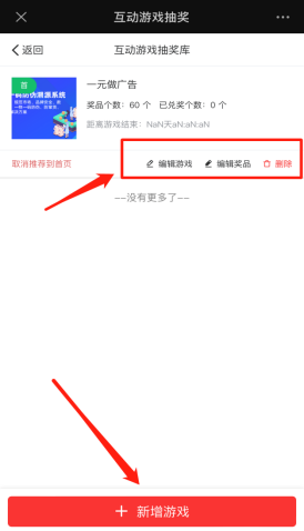 互动抽奖可查看已存在游戏内容,编辑游戏,编辑奖品,删除游戏等。也可以新增游戏,添加游戏必填项以’*’标识,填写完毕,根据活动设置概率类型,抽奖次数,设置背景音乐,游戏封面图等。设置好之后点击保存游戏。接着设置活动奖品,可以添加新奖品,或者修改删除奖品,新增奖品不可重复相同奖项。如下图所示: