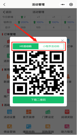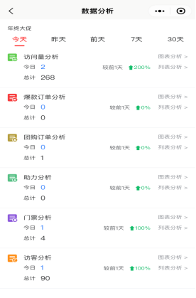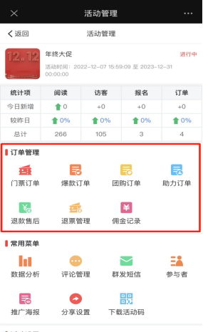 查看该活动访问量、爆款订单、团购订单、助力订单、门票订单分析入口。如下图所示: