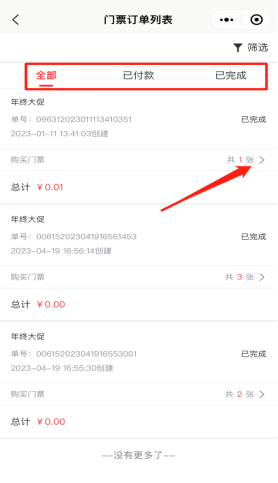 查看活动下所有已付款,已完成的门票订单,以及查看购票信息等。如下图所示: