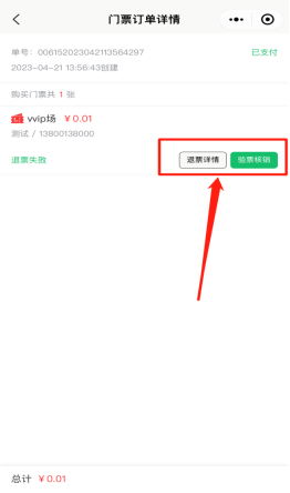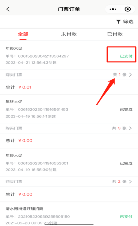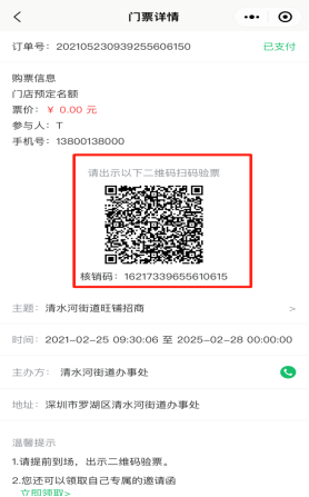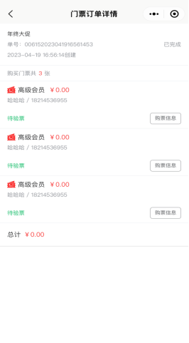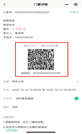 查看该用户下参与购买的所有门票订单记录,包括未付款、已付款订单。可以点击查看订单,点击验票核销,出示订单核销二维码,或者查看其他退票详情等。如下图所示: