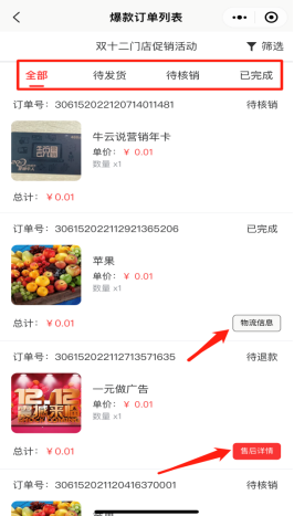 查看该活动下,所有爆款产品订单,如待发货,待核销,已完成状态等。点击可查看对应订单的购买信息,售后详情等。如下图所示: