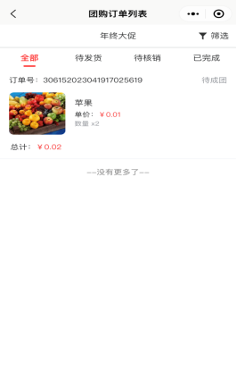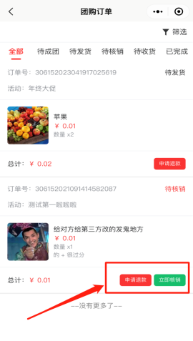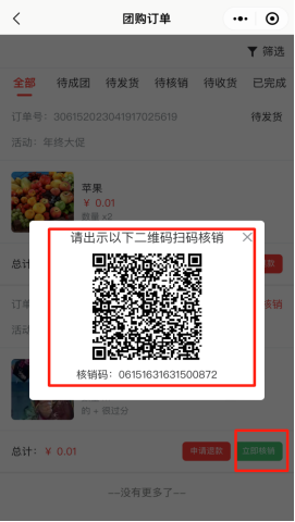 查看该用户下参与购买的所有参与的团购订单记录,包括待成团、待发货、待核销、待收货、已完成订单。可以点击申请退款操作,点击立即核销出示订单二维码,则商家用微信扫码进行核销即可。如下图所示: