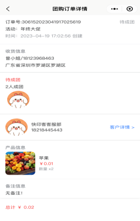 查看该活动下,所有拼团产品订单,如待发货,待核销,已完成状态等。点击可查看对应订单的购买信息,成团情况等。如下图所示:
