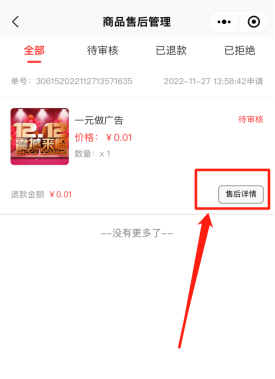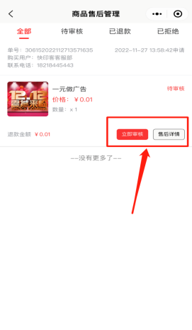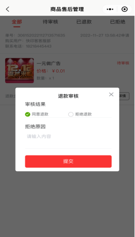 关于该活动下,各类营销产品,申请退款的售后处理。可以进行审核退款售后订单,同意退款或者拒绝。如下图所示: