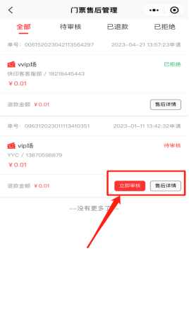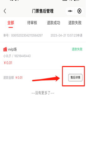 所有申请售后处理的门票售后记录,可查看售后处理详情情况。如待审核、退款成功、退款失败订单。如下图所示: