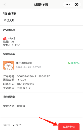 关于该活动下,门票订单售后处理。查看退款订单的详情,同意退款或者拒绝。如下图所示: