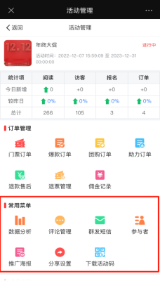 常用菜单,主要是一些基础数据信息,如数据分析,评论管理,群发短信,参与者信息,推广海报,分享设置,下载活动二维码。如下图所示: