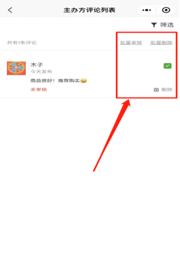 评论管理,该活动下用户的评论记录,主办方可以进行审核评论、删除评论。同意后则该条评论会出现在活动的首页里。如下图所示:
