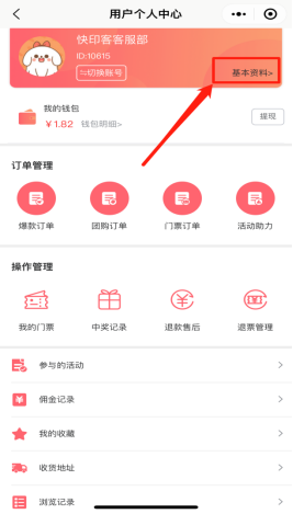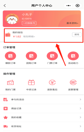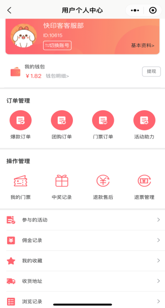 用户个人中心包含用户的个人资料、我的钱包、订单管理、操作管理、参与的活动、佣金记录、我的收藏、收货地址、浏览记录。如下图所示: