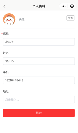可以修改用户的个人头像,昵称,姓名,手机,地址等等。如下图所示: