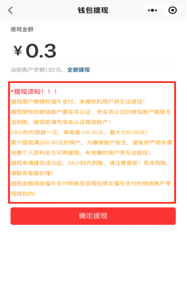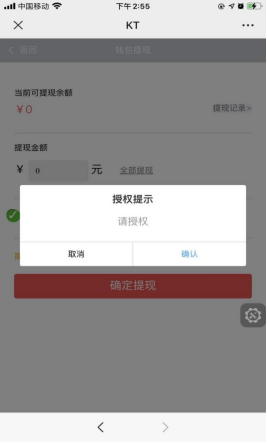 查看钱包账户的全部收入和提现记录,对钱包进行授权后,可以进行提现操作(注:仅第一次需要授权,24小时内提现1次,最小金额0.3元,累计提现满200元需要完善个人资料)如下图所示: