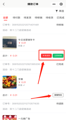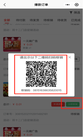 查看该用户下参与购买的所有爆款订单记录,包括待付款、待发货、待核销、待收货、已完成订单。可以点击申请退款操作,点击立即核销出示订单二维码,则商家用微信扫码进行核销即可。如下图所示: