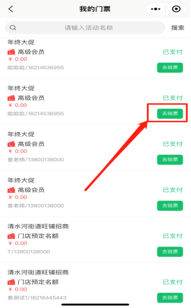即该用户参与购买的所有门票记录,可以通过搜索活动名称查找购买的门票。可以点击对应门票去验票。如下图所示: