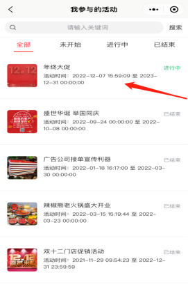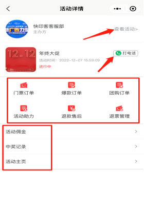查看所有参与的活动信息,包括进行中,已结束的活动。点击任意活动进入,可以详细查看该活动详情,联系主办方,以及该活动下所有参与购买的门票订单、爆款订单、团购订单、活动助力、退款售后、退票管理、活动佣金、中奖记录、活动主页等。如下图所示: