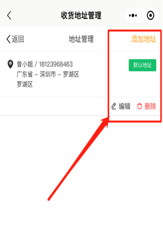 用户可以添加收货地址,用于购买活动中商品的订单收货地址。可以设置默认地址,快捷选择。如下图所示: