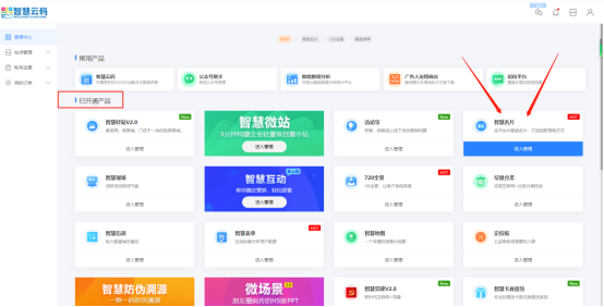 第一步:首先登录智慧云码系统,找到已开通产品,点击智慧名片,便可进入搭建设置添加界面,就能找到左边企业名片,如下图所示:
