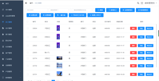 企业管理员工入口,可以进行修改添加删除员工信息;员工管理包含搜索、新增员工、设置管理员、取消管理员、设置在职、设置离职、一键交接、导出员工名片码、批量上传员工、删除、详情、修改名片