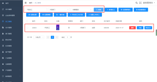 根据员工姓名、部门、管理员状态进行筛选出对应员工