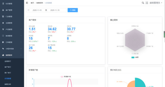 客户简报:包含成交金额、成交率、活跃率、转发数、保存数、点赞数、客户总数、客户跟进数的数据