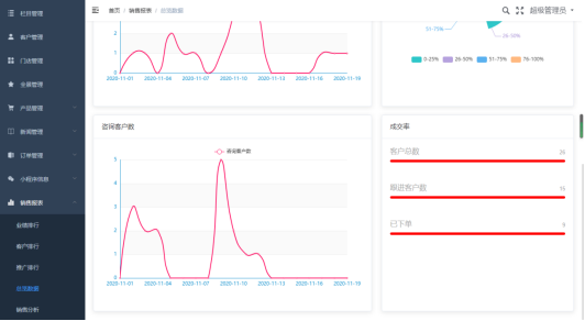成交率:企业客户总数、跟进客户数、已下单数据统计